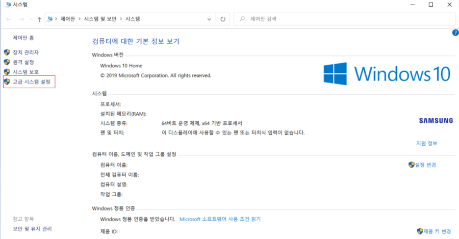 1) 제어판 -> 시스템 및 보안 -> 시스템에 들어가면 위와 같은 화면이 뜬다 여기서 '고급 시스템 설정'을 누른다