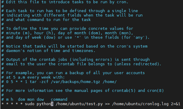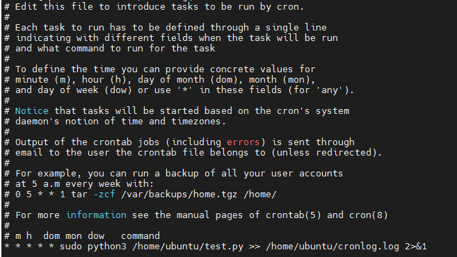 매일 12시에 실행 : * 12 * * * sudo python3 /home/ubuntu/test.py