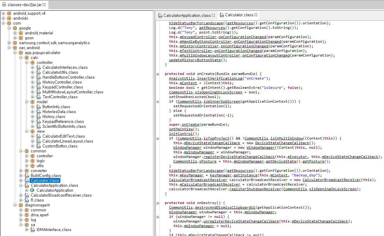 현재 예시에서 보여지는 삼성 계산기의 경우 메인 액티비티의 명은 Calculator.class였다