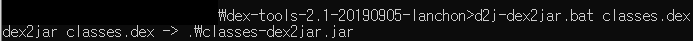 우선 앞서 추출한 classes.dex라는 파일을 이 경로에 넣어주고 커맨드 창에서 해당 경로로 이동 후 다음과 같이 실행한다