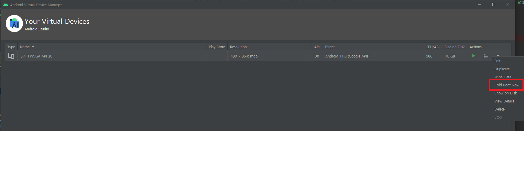 Tools -> AVD Manager를 실행 시킨 후 오류가 발생한 Virtual Device의 가장우측에 아래방향 화살표를 누른 뒤 'Cold Boot Now' 버튼으로 디바이스가 자동으로 재시작되며 리붓되어 정상동작한다