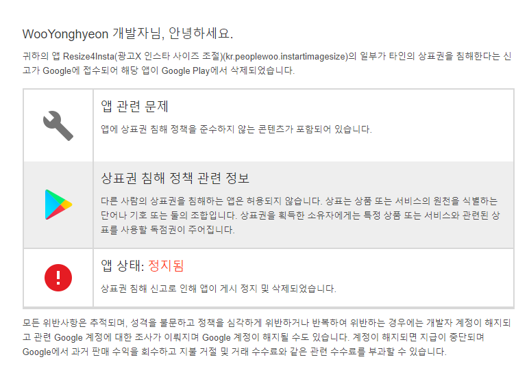 억울하다고 이의제기 하였으나 구글에서는 신고 당사자(인스타)와 합의볼 때 까지 풀어줄 수 없다 라고하고 합의가 안된다면 관련 내용을 수정해서 새로 앱을 등록해봐라, 만약 추가적인 위반이 있다면 계정도 정지 될 수 있다라는 답변뿐
