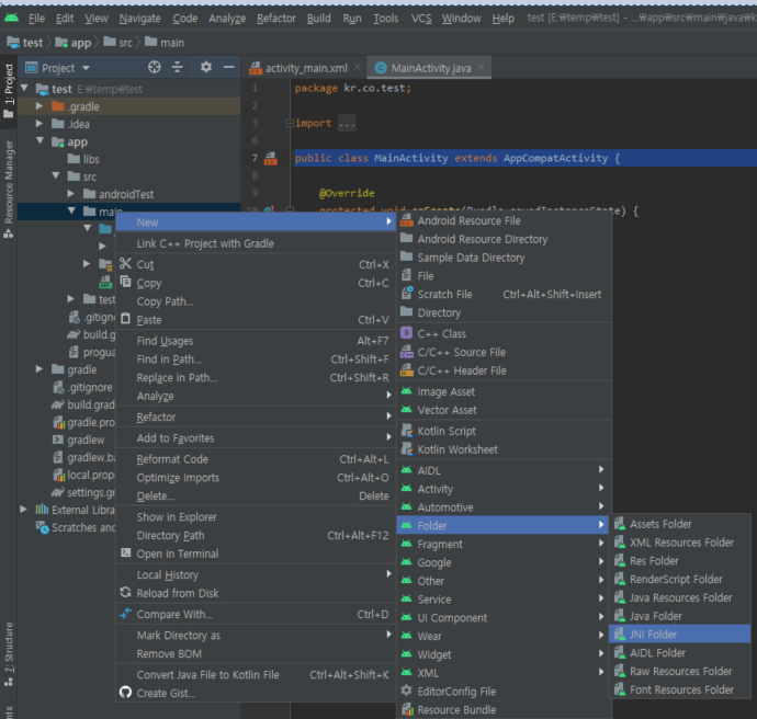 우선 프로젝트에서 main에서 jniLibs 라는 명의 폴더를 생성해줍니다