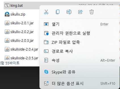 bat파일을 열기가 아닌 메모장으로 안에 내용을 수정하기 위해 '편집' 기능이나 압축파일 우클릭 시 별도 '압축 프로그램으로 압축' 혹은 '해제' 혹은 '미리 보기' 등 다양한 기능을 사용하려면 가장 하단에 더 많은 옵션 표시 버튼을 눌러야 합니다