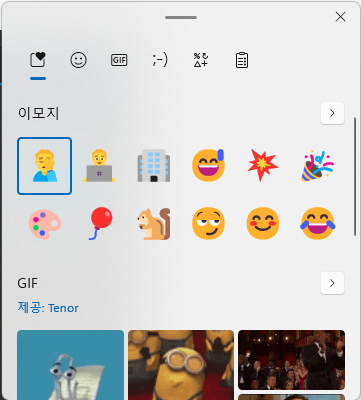 윈도우키 + . 을 눌렀을 때 뜨는 이모티콘 창에서 gif, 클립보드 관리(기존 윈도우+v기능), 이모티콘, 특수문자, 카모지 모두 사용 가능합니다