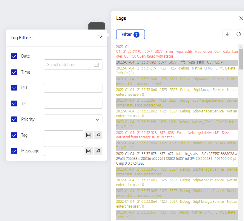 - 로그 필터가 설정 가능하다 필자는 윈도우10, 11 최신 크롬 환경에서 필터에서 영어가 안 적히거나 백스페이스 혹은 딜리트가 안 먹히는 문제가 있었다 그래서 글자를 지울 때는 블록 지정해서 우클릭 잘라내기를 했고 영어를 적을 때는 메모장에 적어서 복사 붙여 넣기로 넣었다