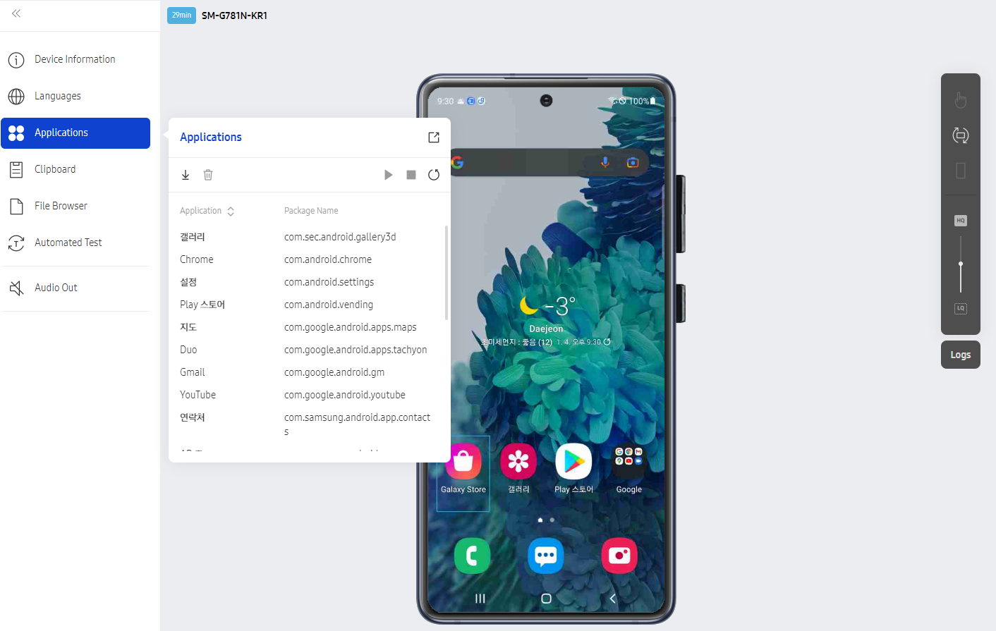 - Applications : 설치된 앱명과 패키지명, 좌측 상단 휴지통 좌측 화살표 버튼으로 apk파일을 통해 테스트 할 앱 설치