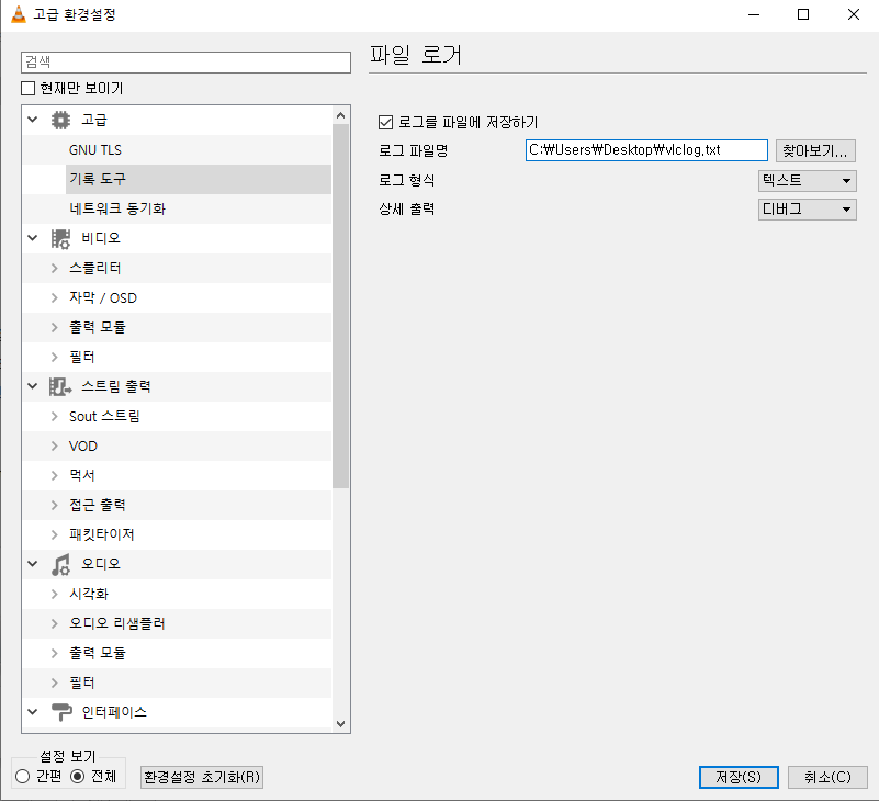 Windows VLC Player -> 도구 -> 환경설정 -> 설정 보기 전체 -> 고급 -> 기록 도구 -> 로그파일 생성