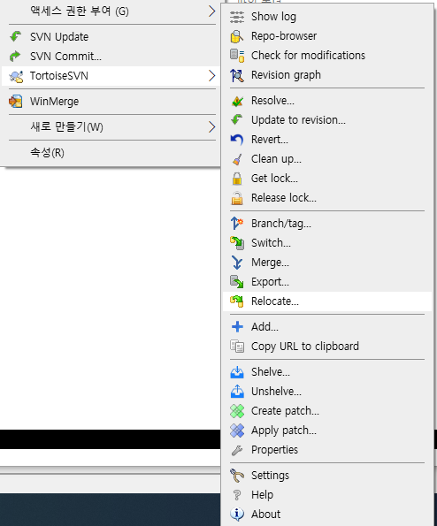2. 해당 svn프로젝트의 경로에서 우클릭 -> TortoiseSVN ->Relocate 선택