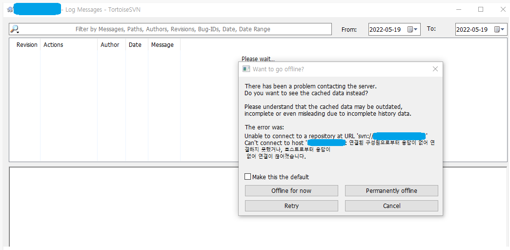 1. SVN을 사용중인 LAS 아이피가 변경되었고 당연히 접근되지 않는다