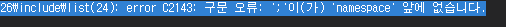 진짜 원인은 저 list를 include 한 cpp 파일 중 하나에 세미콜론이 빠졌던 것이다