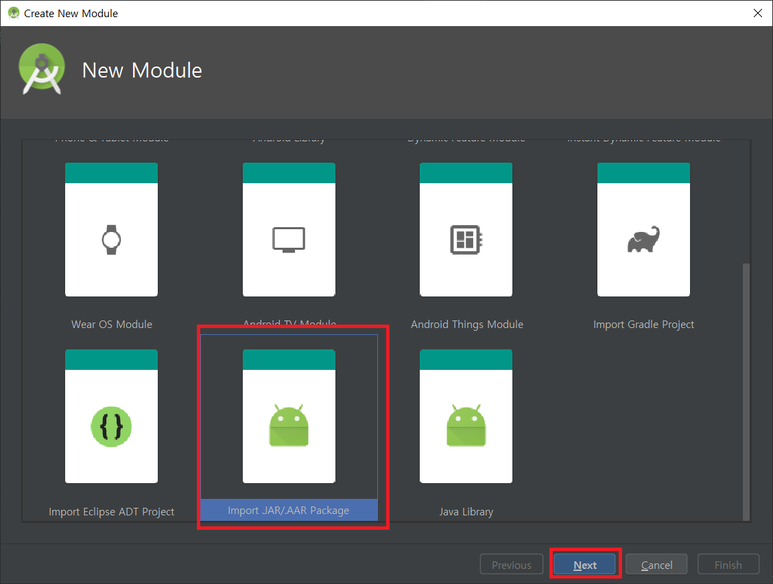 3) Import JAR/AAR Package -> Next