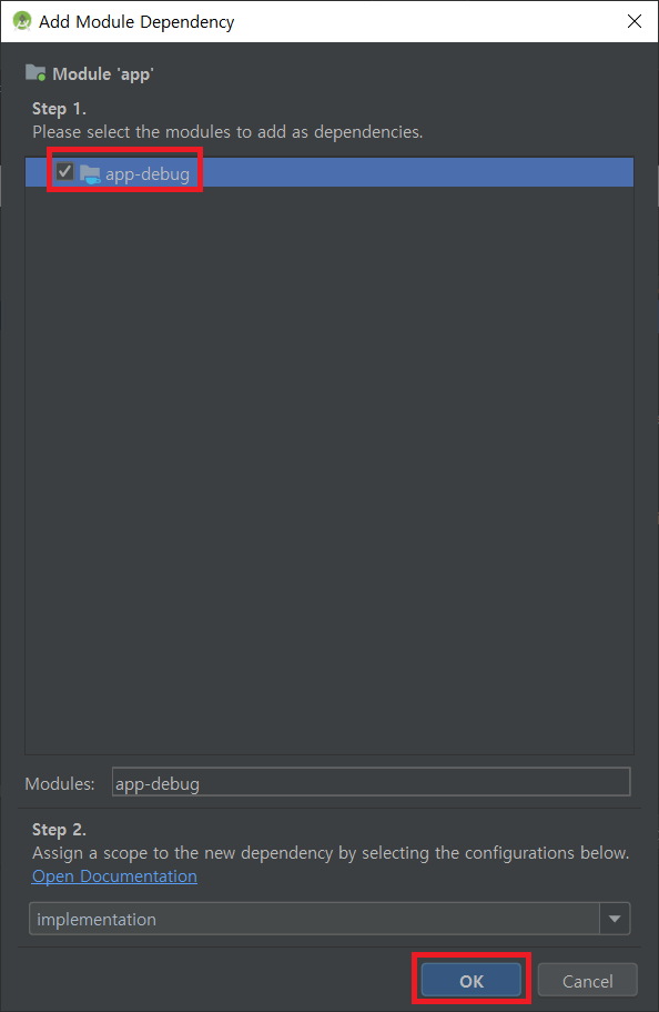 6) app-debug 체크 후 OK 버튼을 누르면 완료