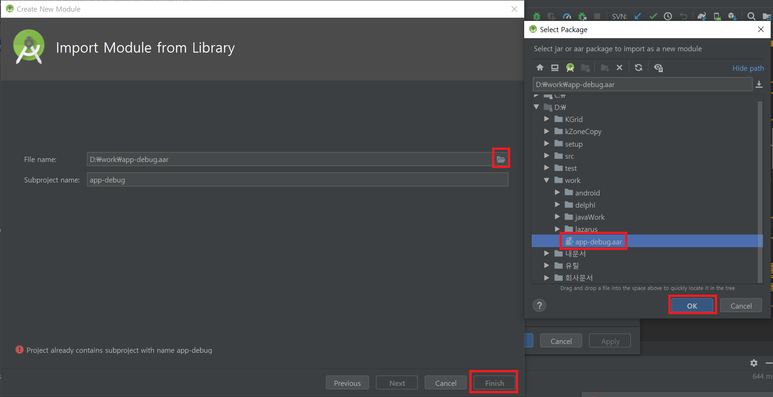 4) 폴더 아이콘 누른 후 전달받은 aar파일 경로를 찾아서 파일 선택 -> Finish