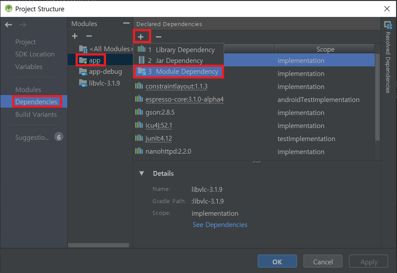 Dependencies -> app 클릭 -> 우측 탭의 ‘+’ 버튼 -> 3 Module Dependency