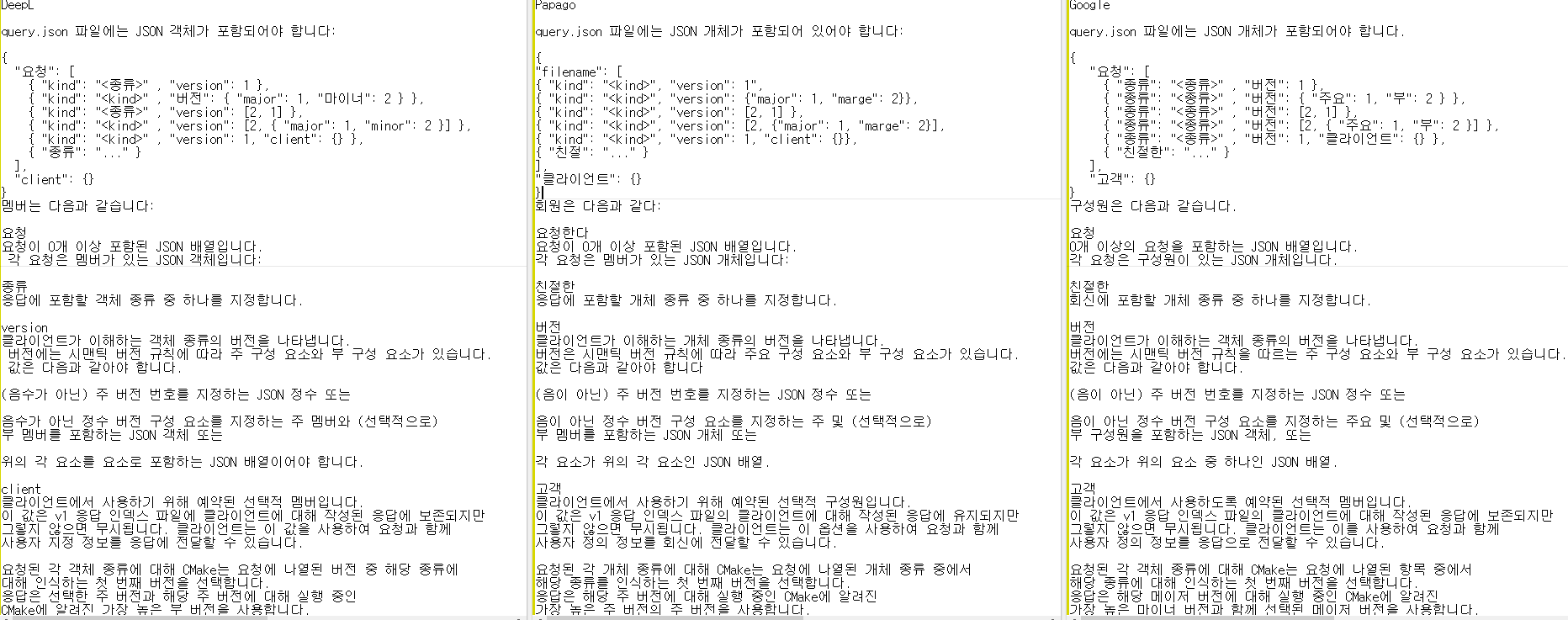 papago에서 json부분에서 minor를 marge로 바꾸는 이상한 행위가 있었지만 이 부분은 어차피 번역이 필요한 부분이 아니니 넘어가고 본문은 거의 비슷하나 마지막 문단에서 papago는 상당히 이해하기 힘들게 번역되었고(주 버전의 주버전을 사용합니다?) 구글과 DeepL은 비슷한 성능을 보였다