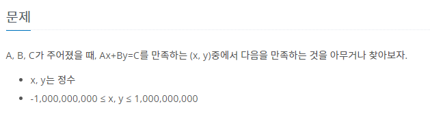 A, B, C가 주어졌을 때, Ax+By=C를 만족하는 (x, y)중에서 다음을 만족하는 것을 아무거나 찾아보자. x, y는 정수 -1,000,000,000 ≤ x, y ≤ 1,000,000,000