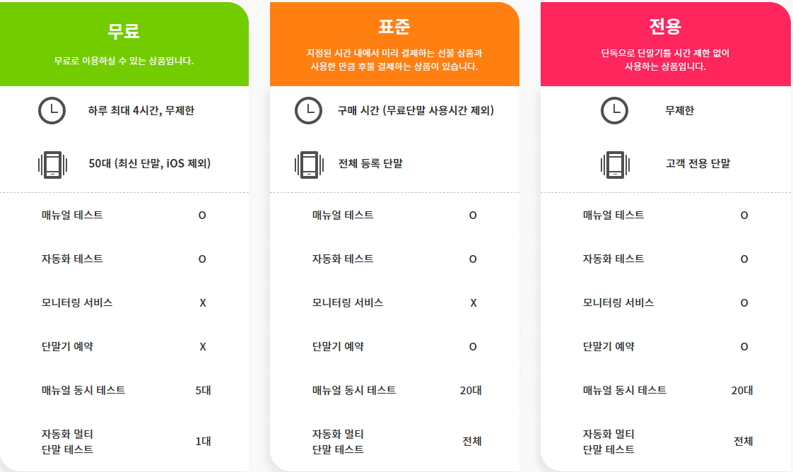 3. mTower : 다양한 요금제가 있었고 수동,자동 테스트가능 기본은 20시간 30만원 (장비1대당 시간이며 예를들어 10대를 동시 테스트하면 2시간에 30만원)
