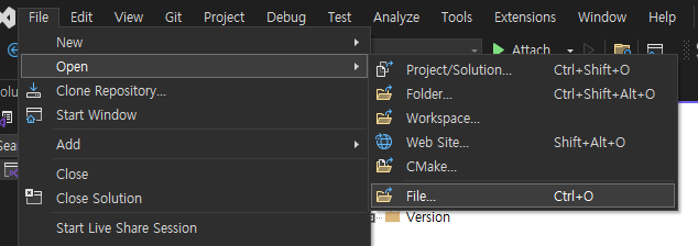 4. File -> Open -> File 순서로 들어가서 각각 솔루션의 .rc파일을 연다.
