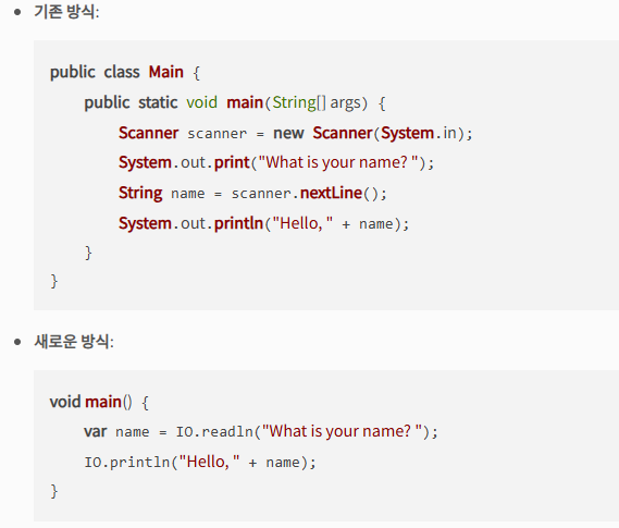 - 이제 Java의 첫 번째 프로그램은 더 이상 public static void main(String[] args) 로 시작하지 않고, 단순화된 void main() 문법으로 작성 가능해짐