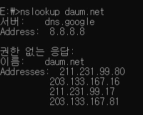 위와 같이 커맨드 명령어로 nslookup [도메인]으로 아이피 내역을 볼 수 있다