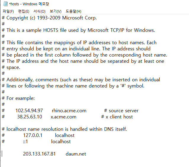 저장하면 즉시 적용되며 웹브라우저에서 daum.net접속시 203.133.167.81로만 접속하게된다