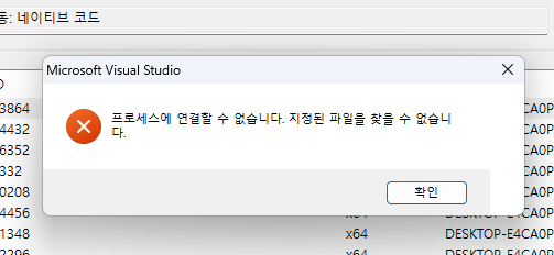 "프로세스에 연결할 수 없습니다. 지정된 파일을 찾을 수 없습니다." 라는 에러가 발생하였다
